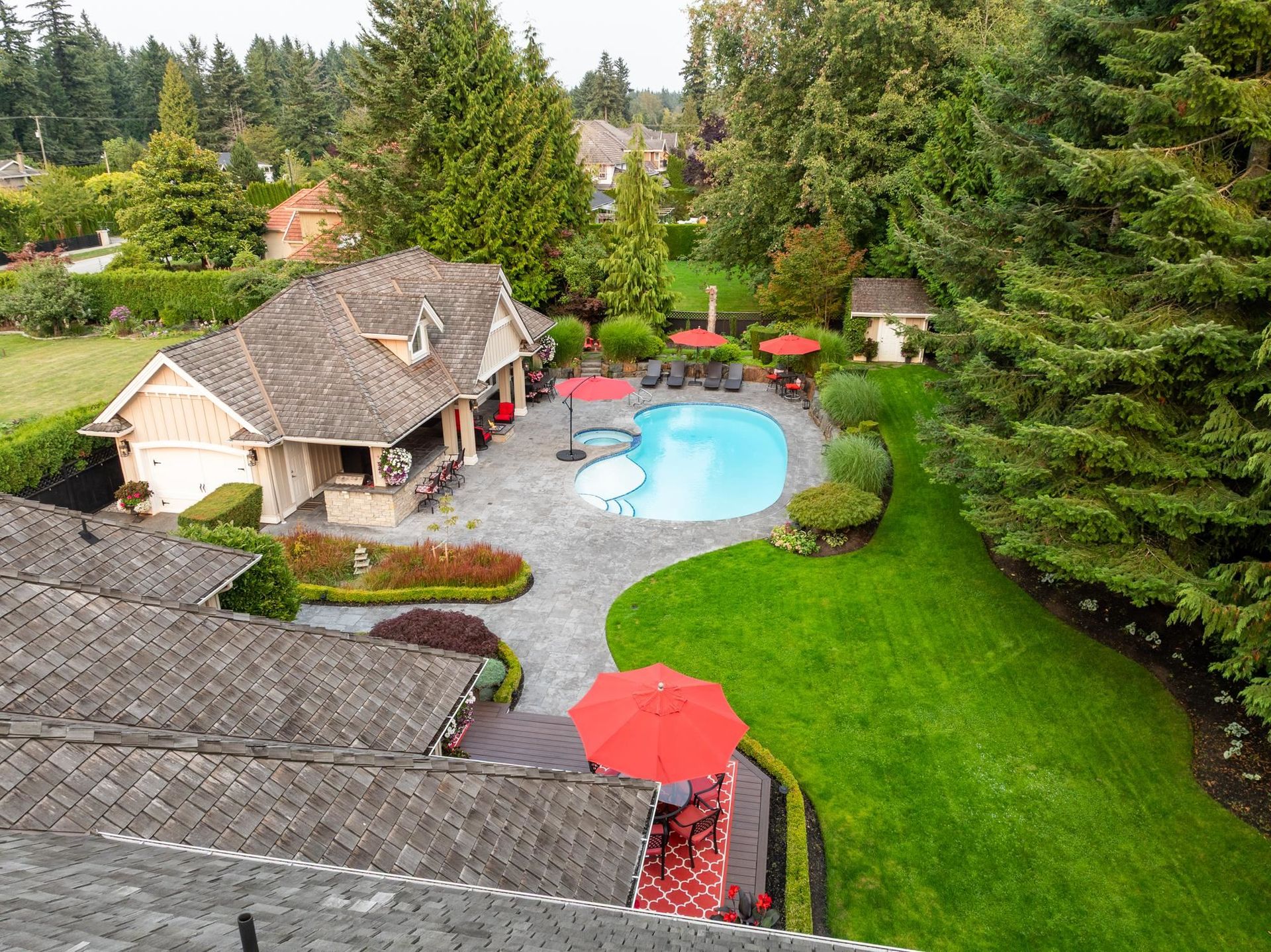 Nestled in the prestigious Elgin Chantrell neighbourhood, this 4 bed, 4 bath family home sits on a sprawling 20,168 sq ft lot offering both comfort and resort-style living. The main floor features a spacious primary bedroom with an oversized ensuite, creating a true private retreat. Designed for entertaining, the outdoor space boasts an outdoor kitchen, sparkling pool, hot tub, and plenty of room for gatherings. An impressive outbuilding provides a private gym, bathroom, and additional garage for added versatility. Inside, bright living areas are enhanced with timeless finishes and thoughtful updates. Perfectly blending elegance and functionality, this residence is located in one of South Surrey’s most sought-after communities, close to top schools, parks, and amenities.